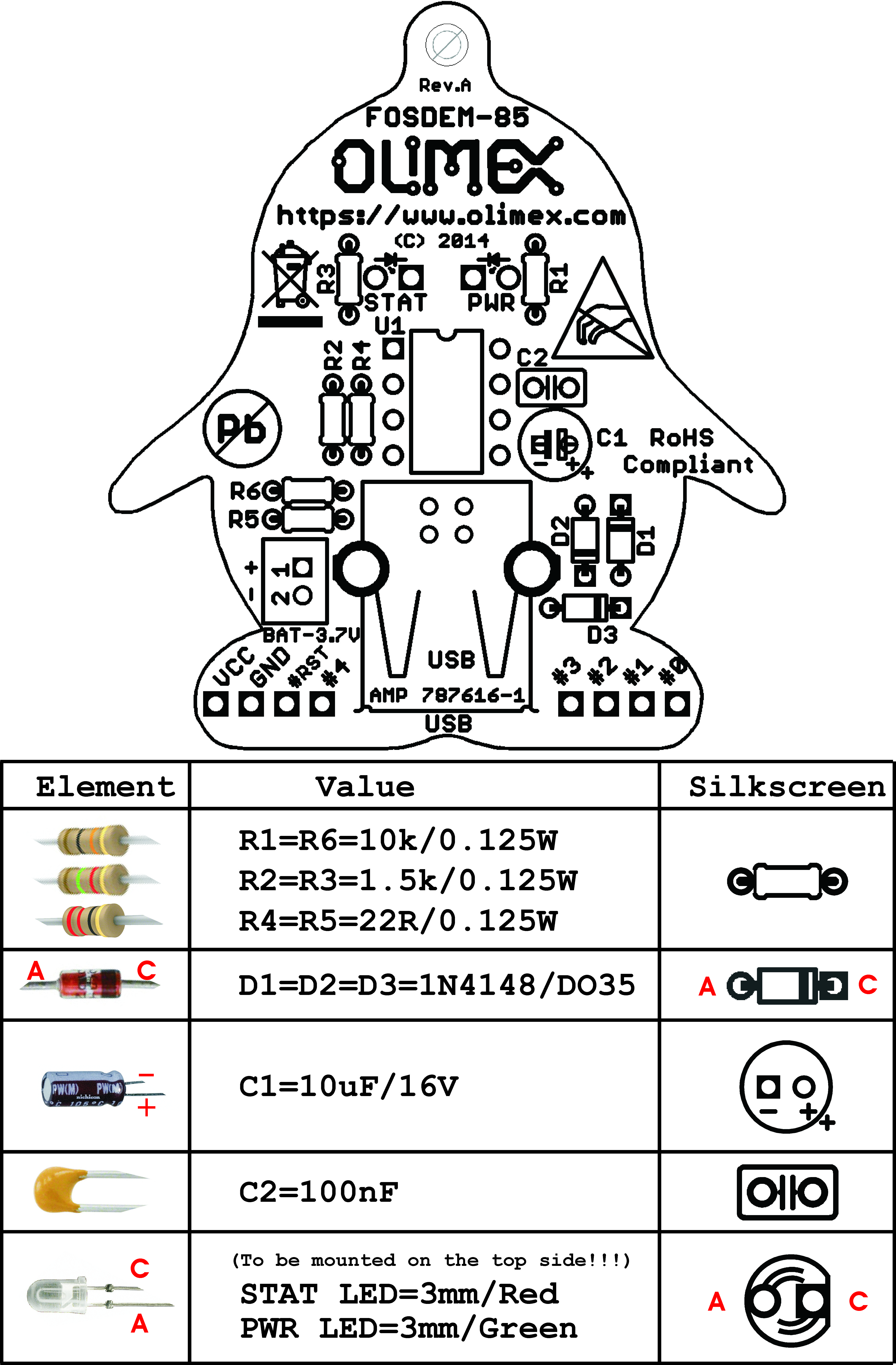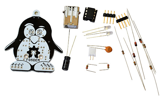 The board comes in the form of a DIY kit - if you like soldering this is the FOSDEM-85 package suitable for you! FOSDEM-85 is a very tiny - Arduino-inspired board. It is built around the well-known Little wire design and uses micronucleus bootloader. The same design is also used for the Digispark and Adafruit’s Trinket. The microcontroller comes preprogrammed with "micronucleus tiny85" that is suitable for use with the Digispark's Arduino distribution.