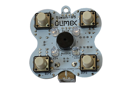 The board is an implementaion of the popular simon game which tests and trains your short-term memory. There are four LEDs and four buttons. The LEDs blink in random pattern which you should repeat with the buttons. Each successful guess increments the amount of blinks. It is built around the well-known Little wire design. The same design is also used for the Digispark and Adafruit’s Trinket. The microcontroller comes preprogrammed with "micronucleus tiny85" that is suitable for use with the Digispark's Arduino distribution.