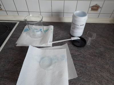The first crystals, that we are growing are copper sulfate crystals. They give an intense blue color and are quite easy to grow. For this, we need to acquire Copper(II)-sulfate pentahydrate. The chemical formula is: $\ce{ CuSO4 * 5 H2O }$